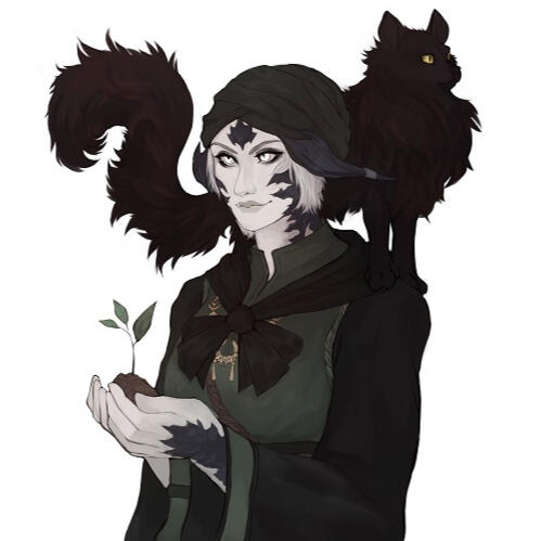 She was once commonly seen in a head wrap due to her status as an outcast and out of fear of recognition. She recently completed a Trial of Fire, sacrificing her covering in a symbolic gesture of ridding herself of her fear.Bukha is rarely seen without the company of her black cat, Bai.